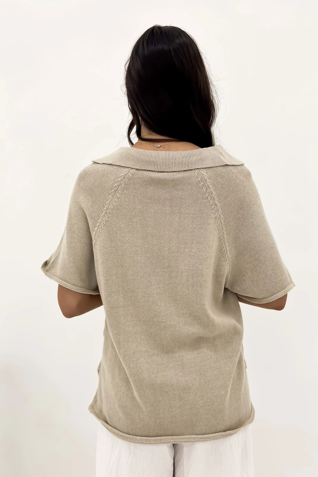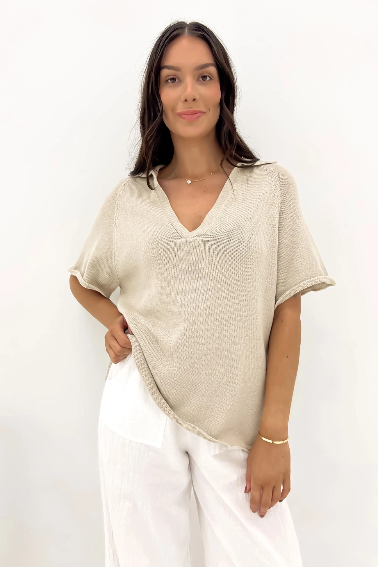 Introducing the Bennett Top in Oatmeal. This top features a collared V neckline for a touch of elegance, along with short sleeves. The side splits on the hemline add a modern touch, all crafted from a comfortable knitted material. Look and feel effortlessly stylish.