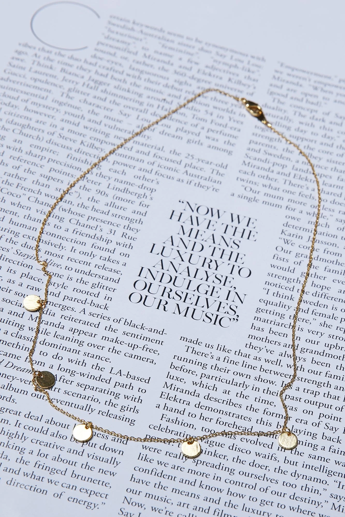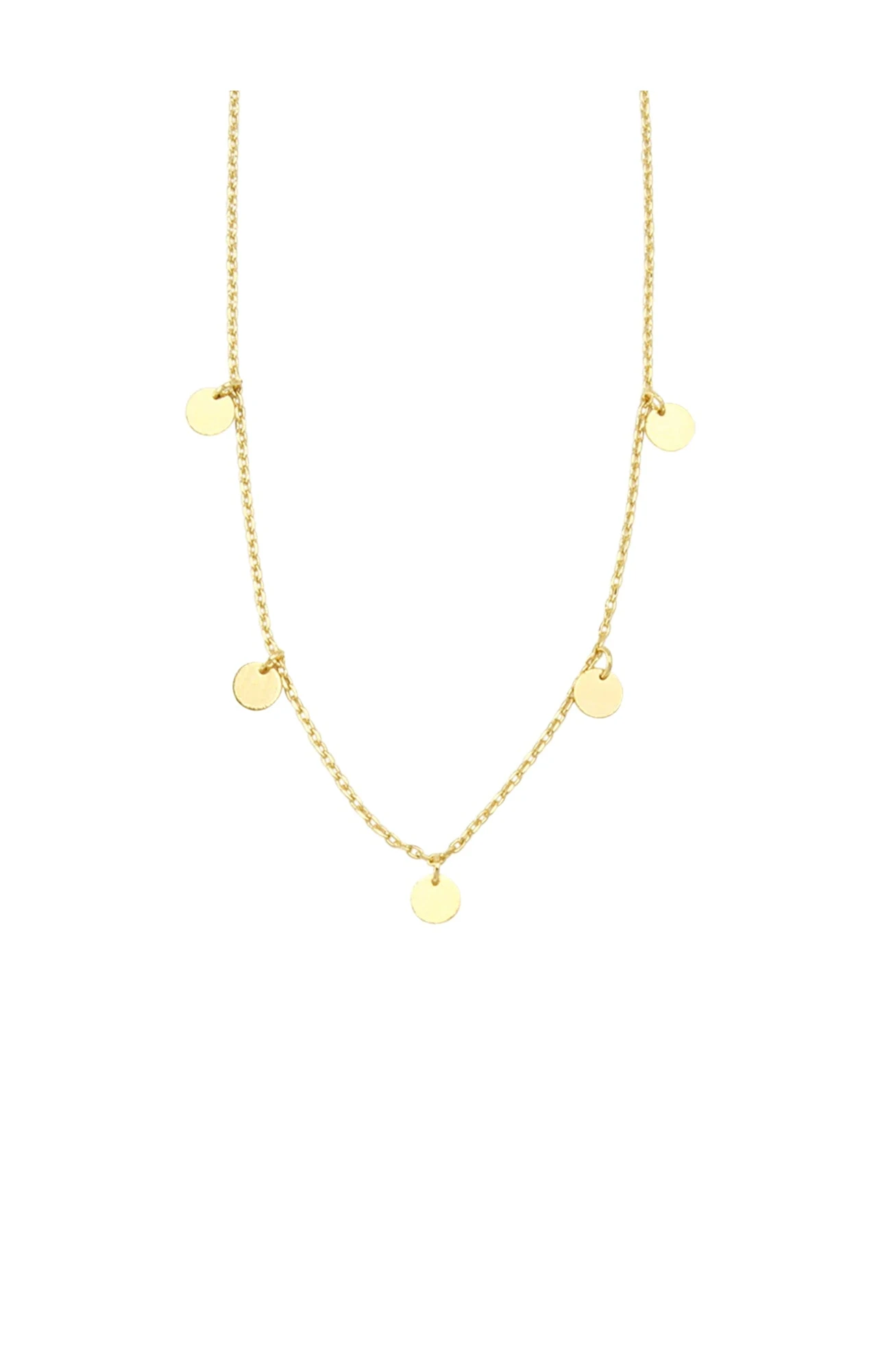 The Charlotte Necklace is a fine necklace featuring 5 circle charms in a brushed finish.