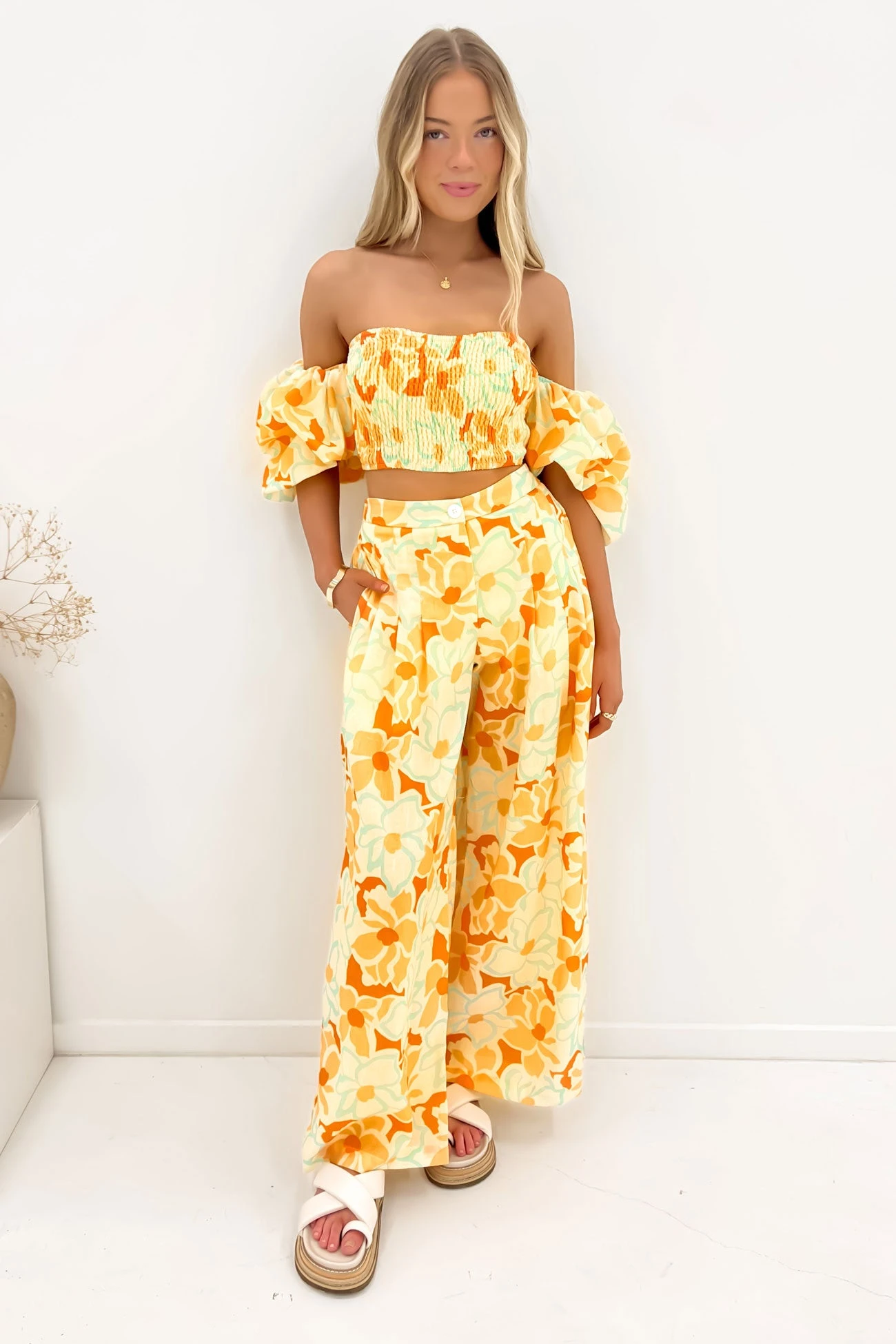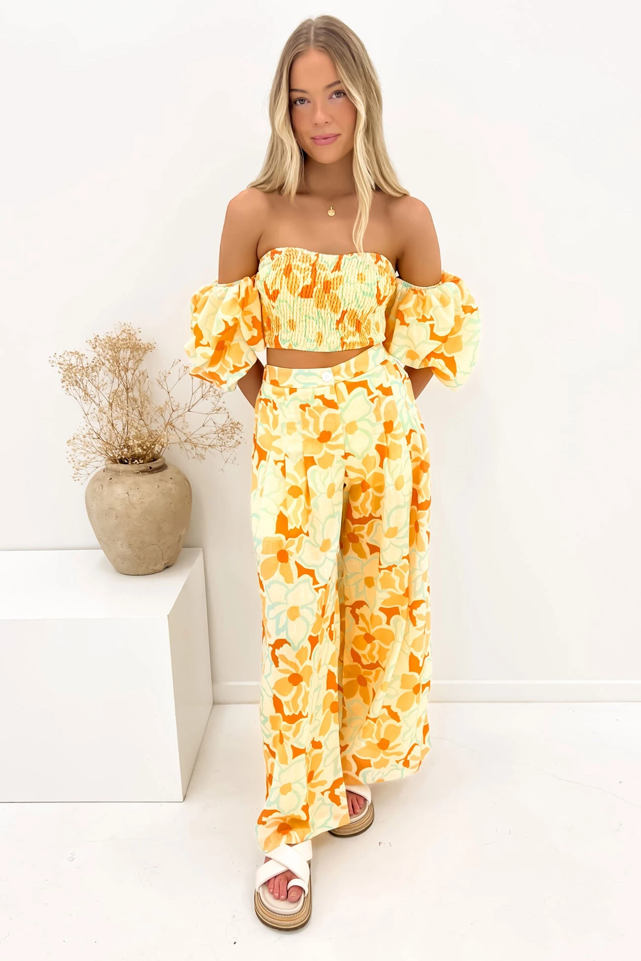 The Cleo Set features a vibrant summery pattern. The top features an elastic shirred front and off the shoulder ruched sleeves, cropped length and zipper on the back. The pants have an elasticated waistband at the back, side pockets, and pleated detail for both comfort and style.
