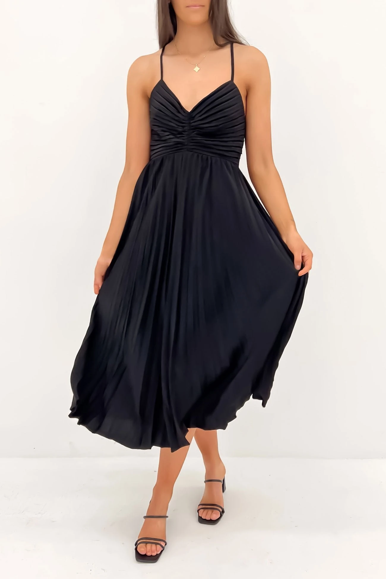 Elevate your style with the Clydie Midi Dress in Black. Featuring elegant pleats for a chic and versatile look.