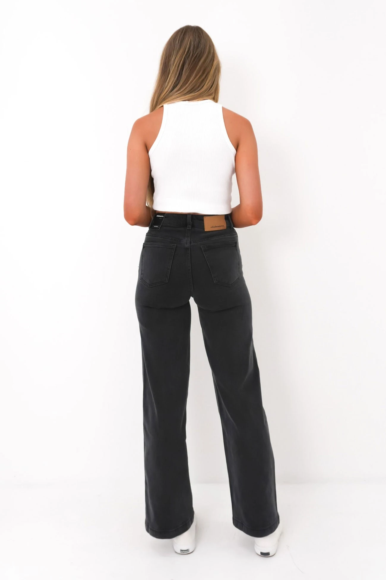 Introducing the Jacqui Wide Leg Jean in Washed Black, a jean that combines a high waist and wide leg. The Jacqui is designed to elevate your denim collection.