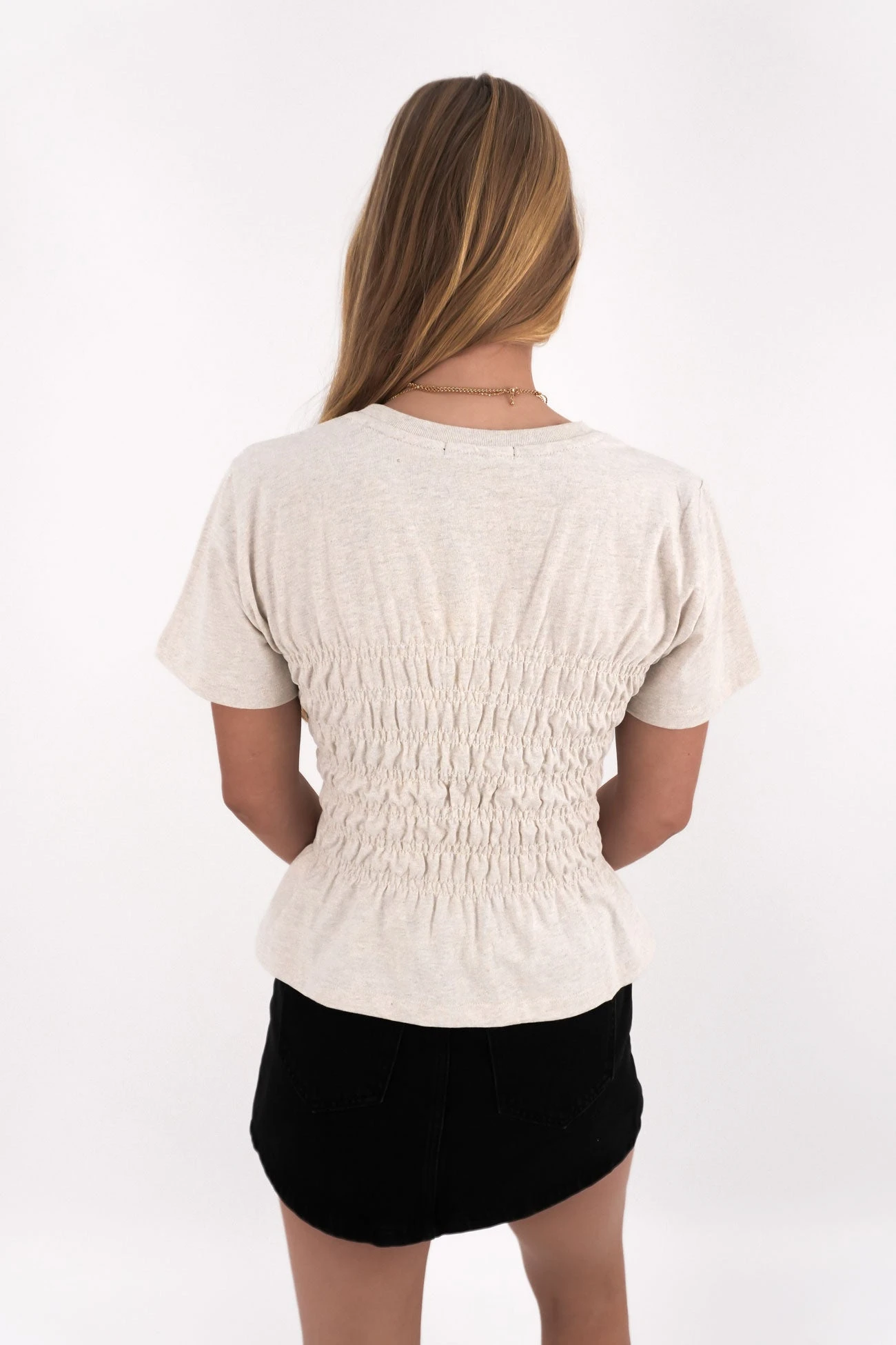 Elevate your everyday style with our chic Lipa Ruched Top, designed to offer a flattering fit and a touch of sophistication, featuring ruching details throughout the main body that created a beautiful silhouette. Crafted from soft, breathable cotton fabric, this tee combines comfort with contemporary flair. Ideal for casual outings or dressier occasions, the perfect versatile addition to any wardrobe. Pair with some denim bottoms and sandals for a more casual look or dress it up with some tailored pants and heels.