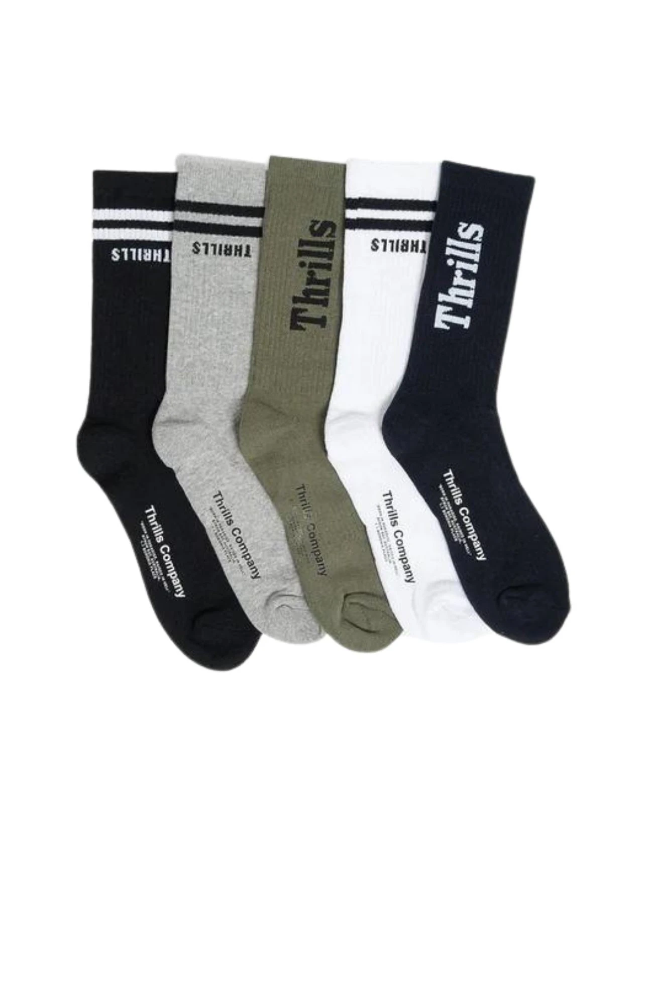The Minimal Thrills 5 Pack Sock is are an essential sock option. The pack includes five different colours, White, Black and Army Green, Total Eclipse and Grey Marle making it easy to mix and match with any outfit.