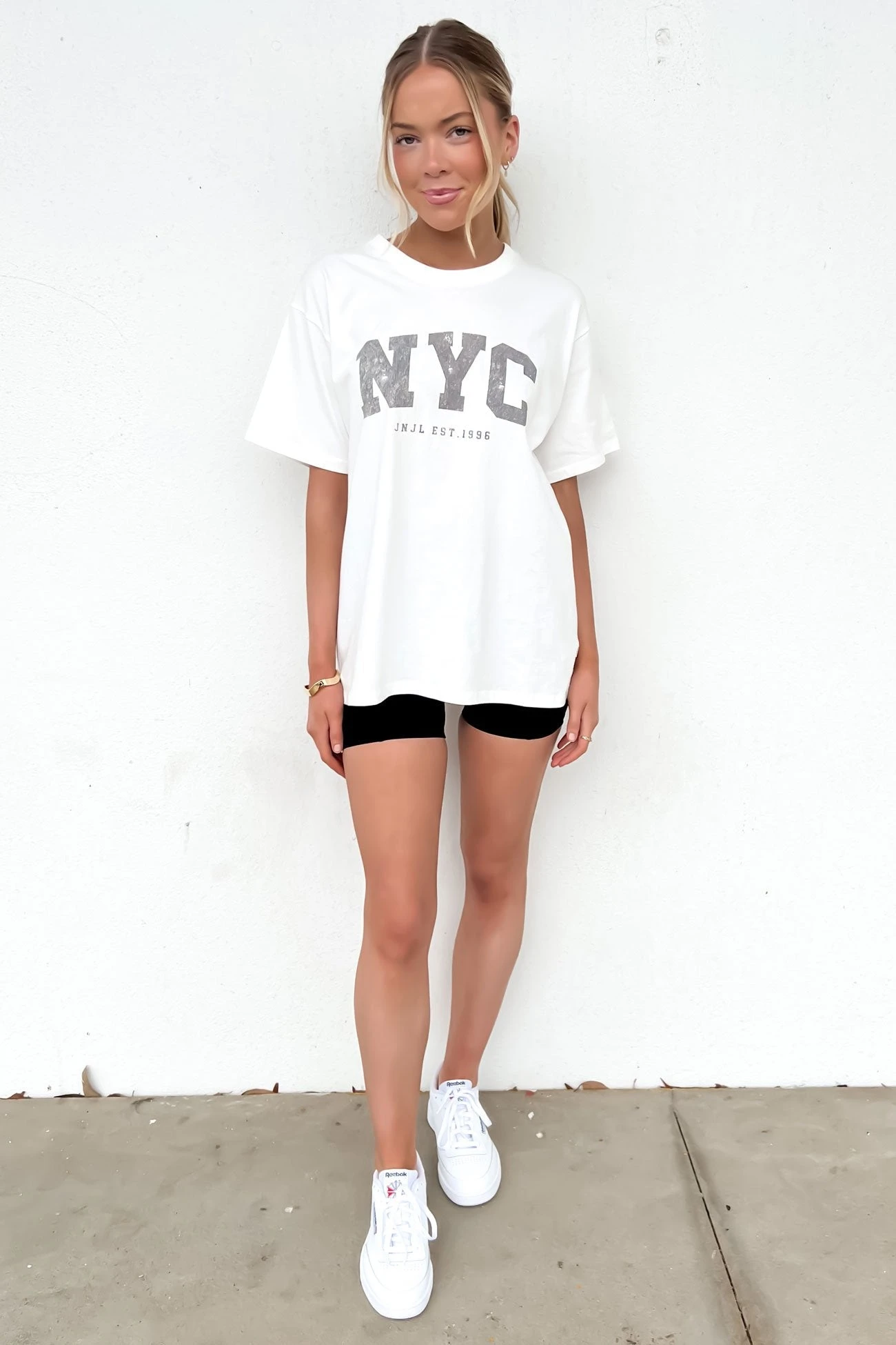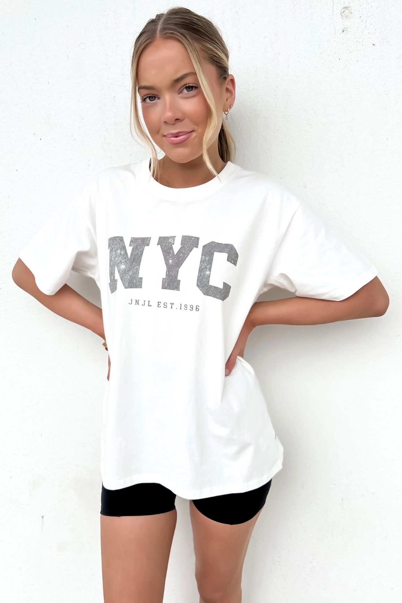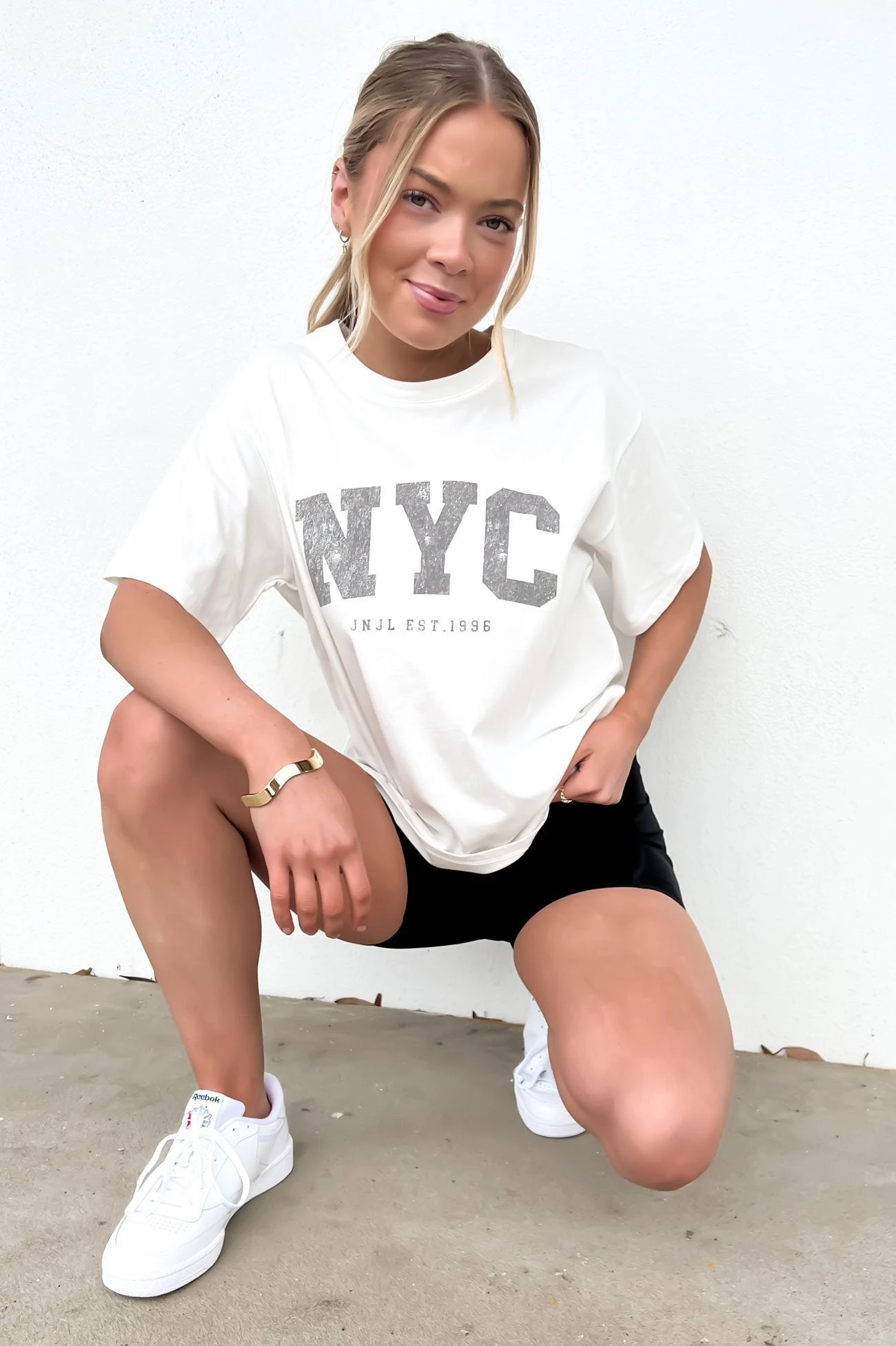 Introducing our NYC Tee in a stylish a vintage white color. The crackled logo on the front adds a unique touch to this classic design. Made for comfort and style, this tee will elevate any casual outfit.