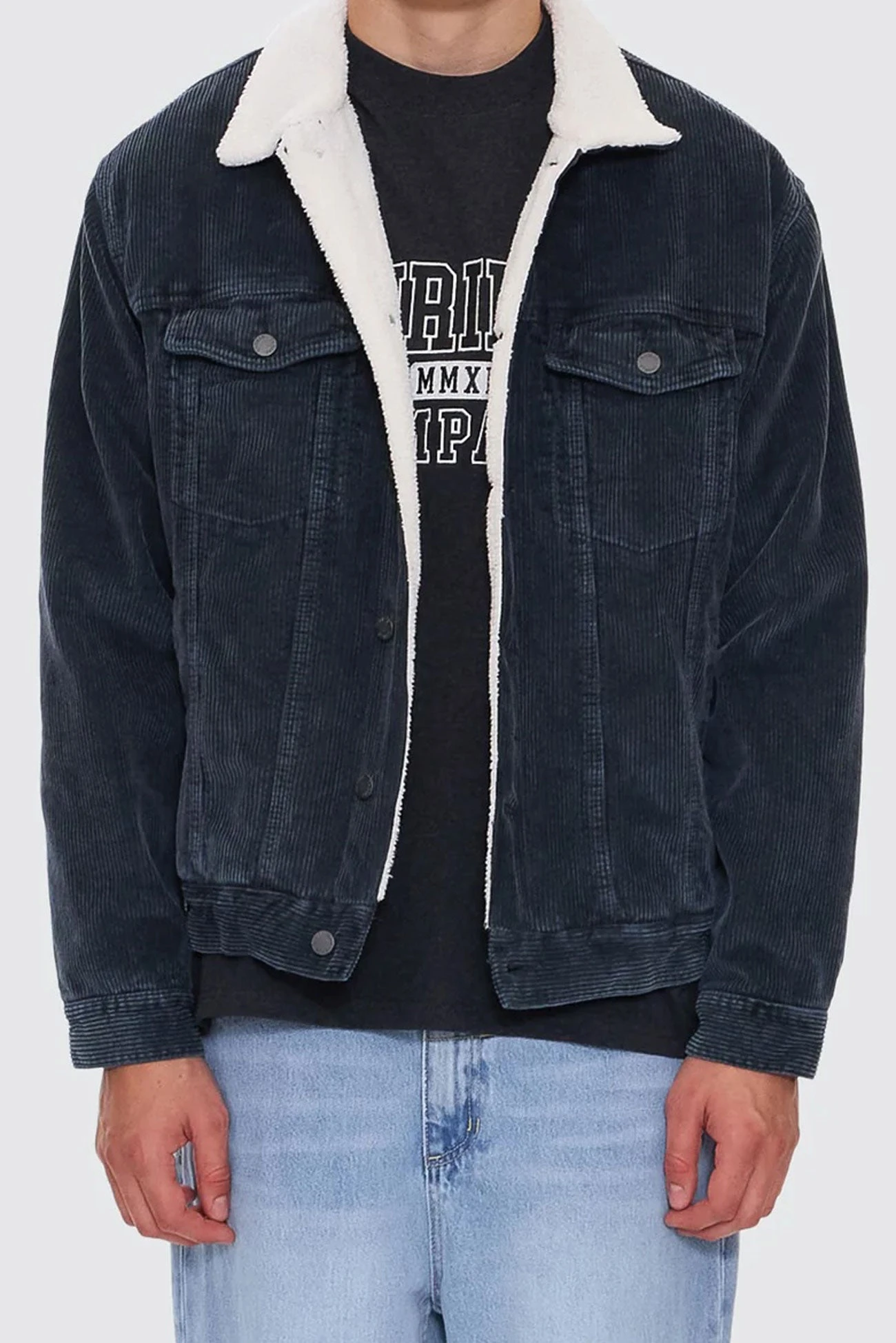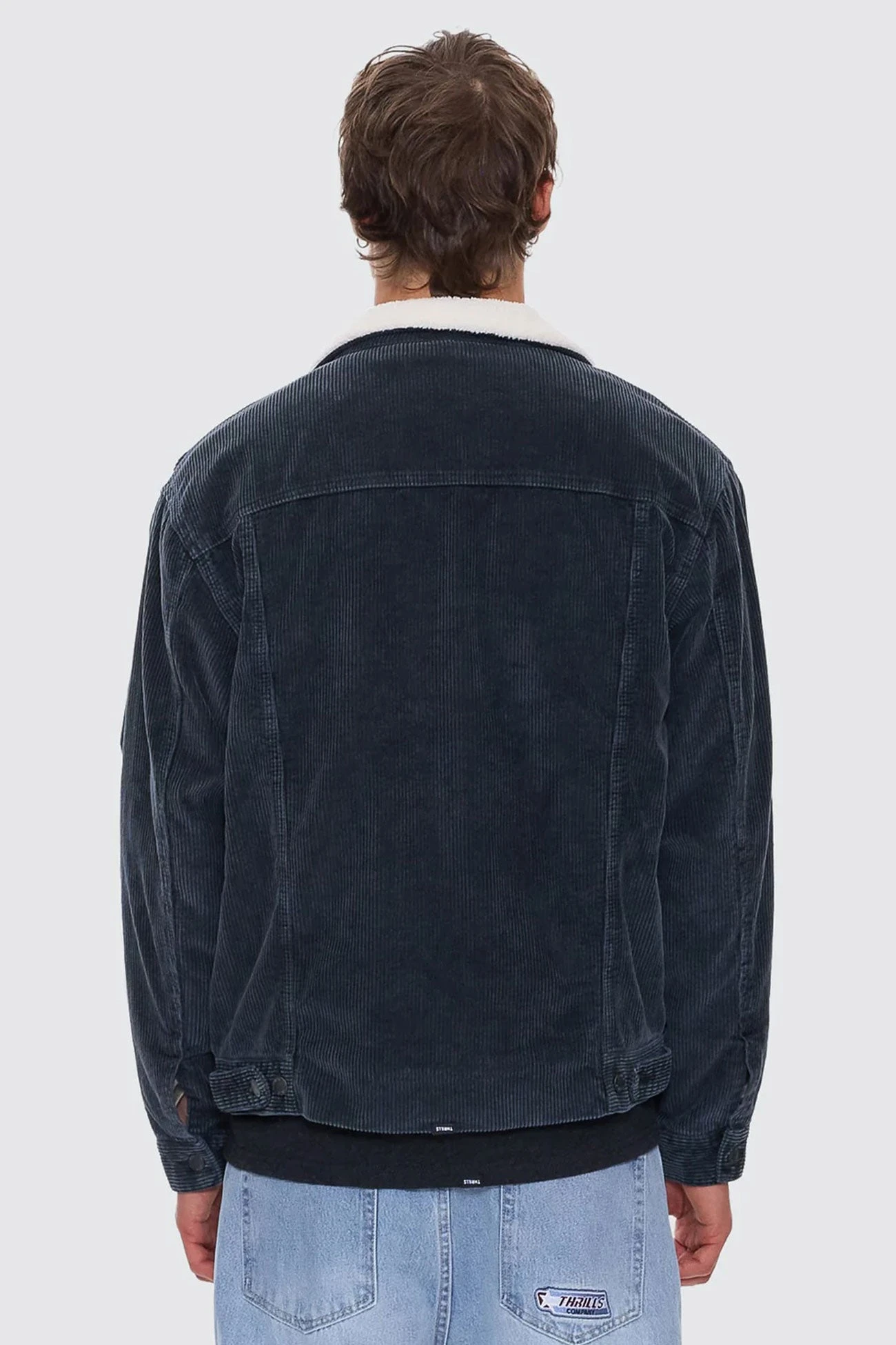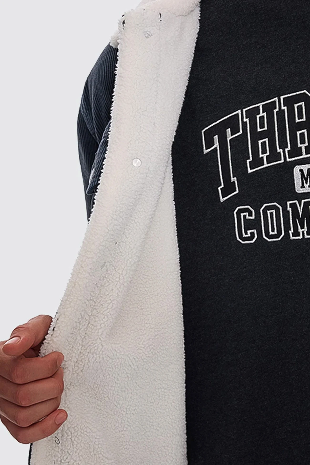 Elevate your outdoor ensemble with the Oversized Sherpa Wanderer Cord Jacket in Ebony, your ultimate cold-weather staple. Combining rugged texture with plush warmth, it’s thoughtfully crafted from cotton with a soft sherpa collar and lining for extra comfort and insulation. The classic trucker silhouette includes dual chest pockets, a button-up front, and a relaxed fit, making it perfect for layering over graphic vintage tees.