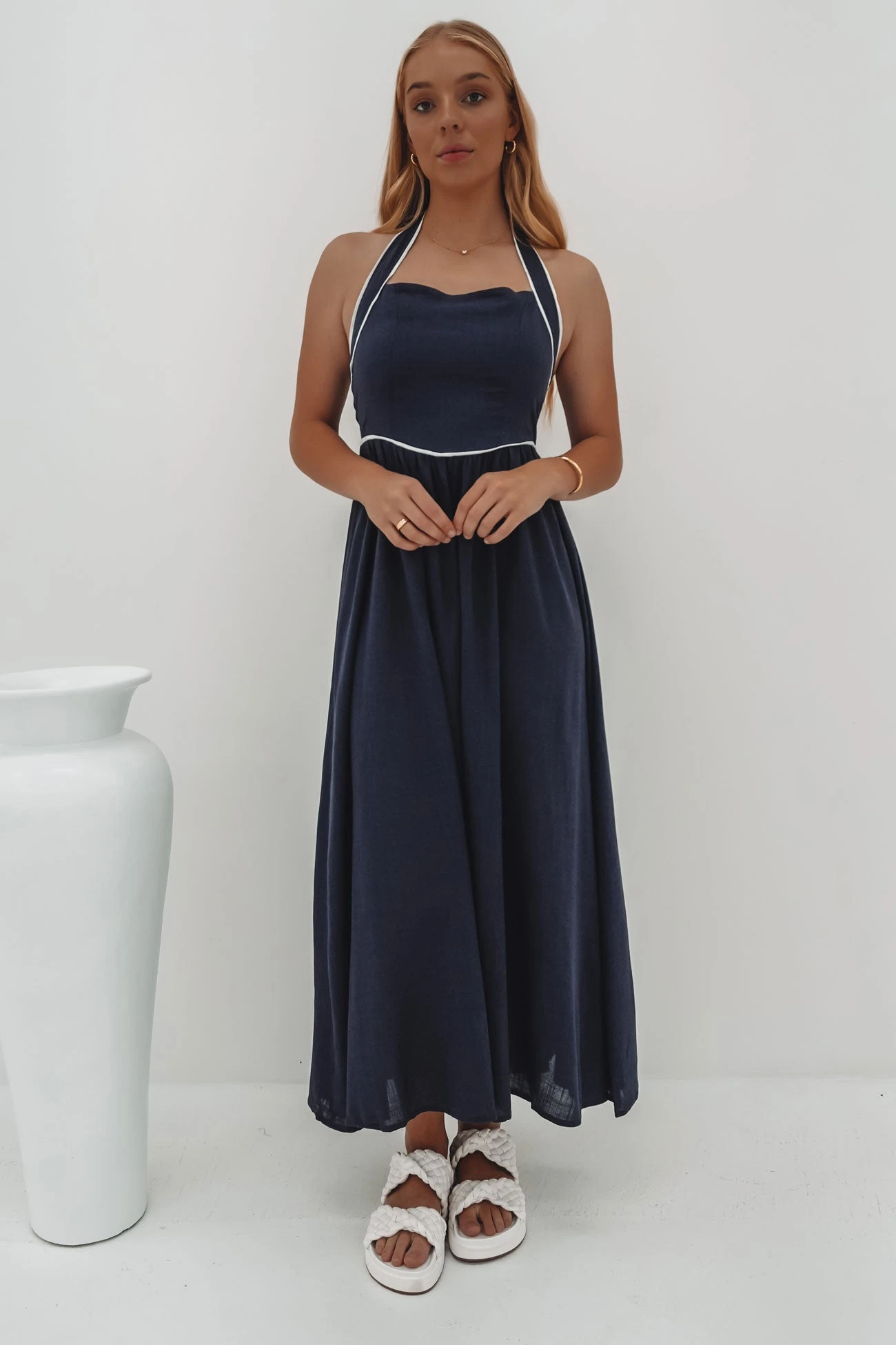 Effortlessly chic and perfect for any occasion, the Sabrina Midi Dress in Navy features a tie up halter neck design and sleeveless silhouette. The invisible zipper on the back ensures a seamless fit, while the white detailing throughout adds a touch of elegance. Upgrade your wardrobe with this must-have piece.