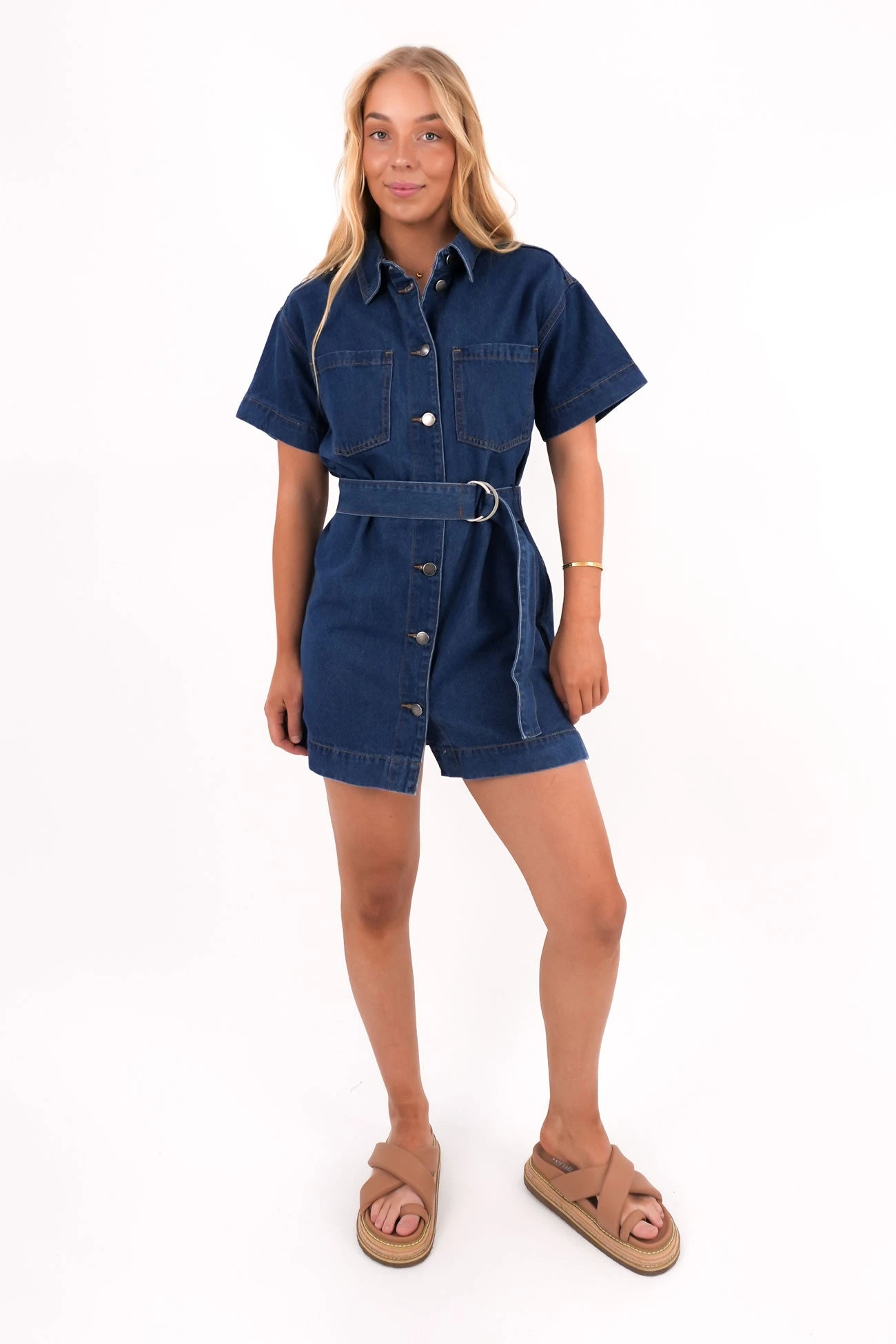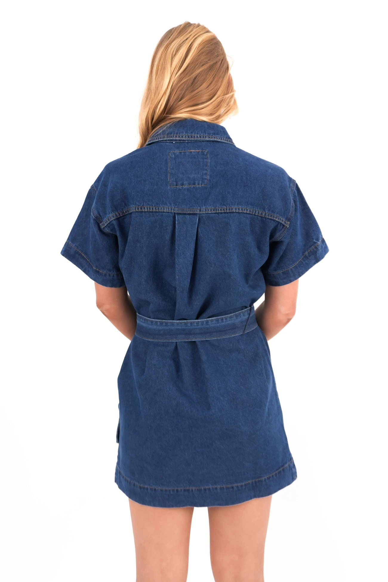 This Sunny Denim Dress in Heritage Blue combines classic style with practical details. Featuring a collared neckline and button-down front, it offers easy wear and a timeless look. The adjustable belt lets you customize the fit for comfort and flattering shape. Perfect for casual outings or layering, this mini dress brings effortless charm to your wardrobe.