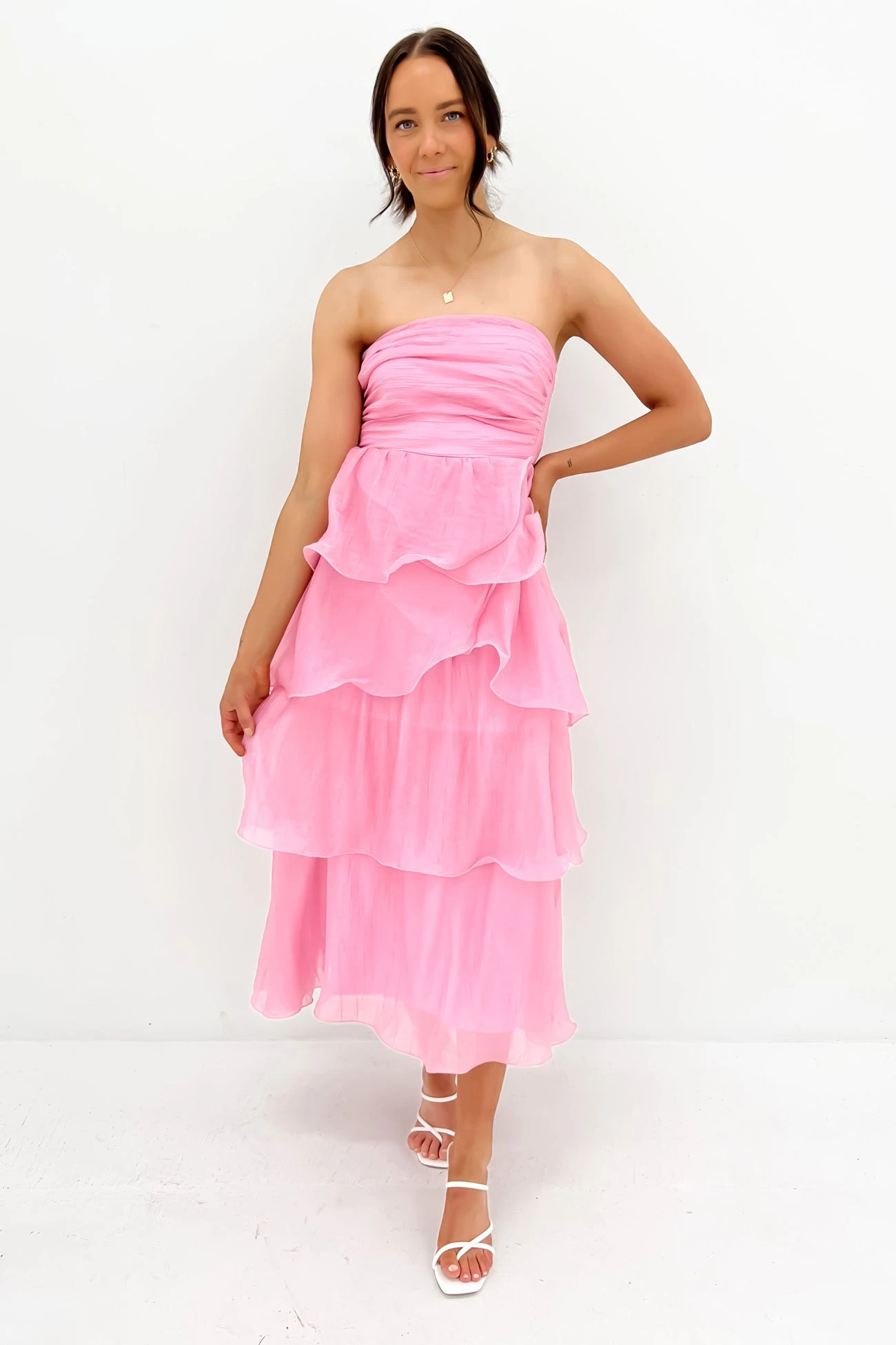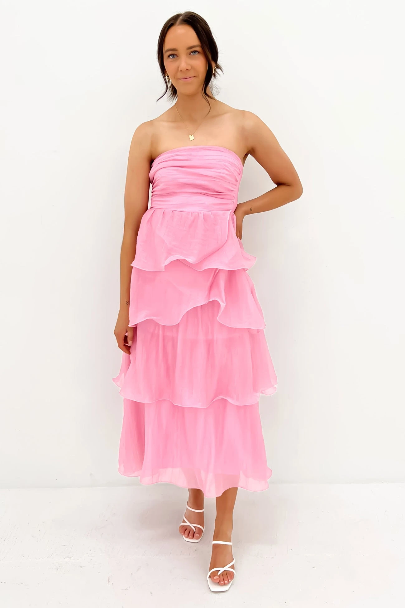 Introducing the Tansy Midi Dress in Pink. This dress offers a flattering midi length and a beautiful pink hue.