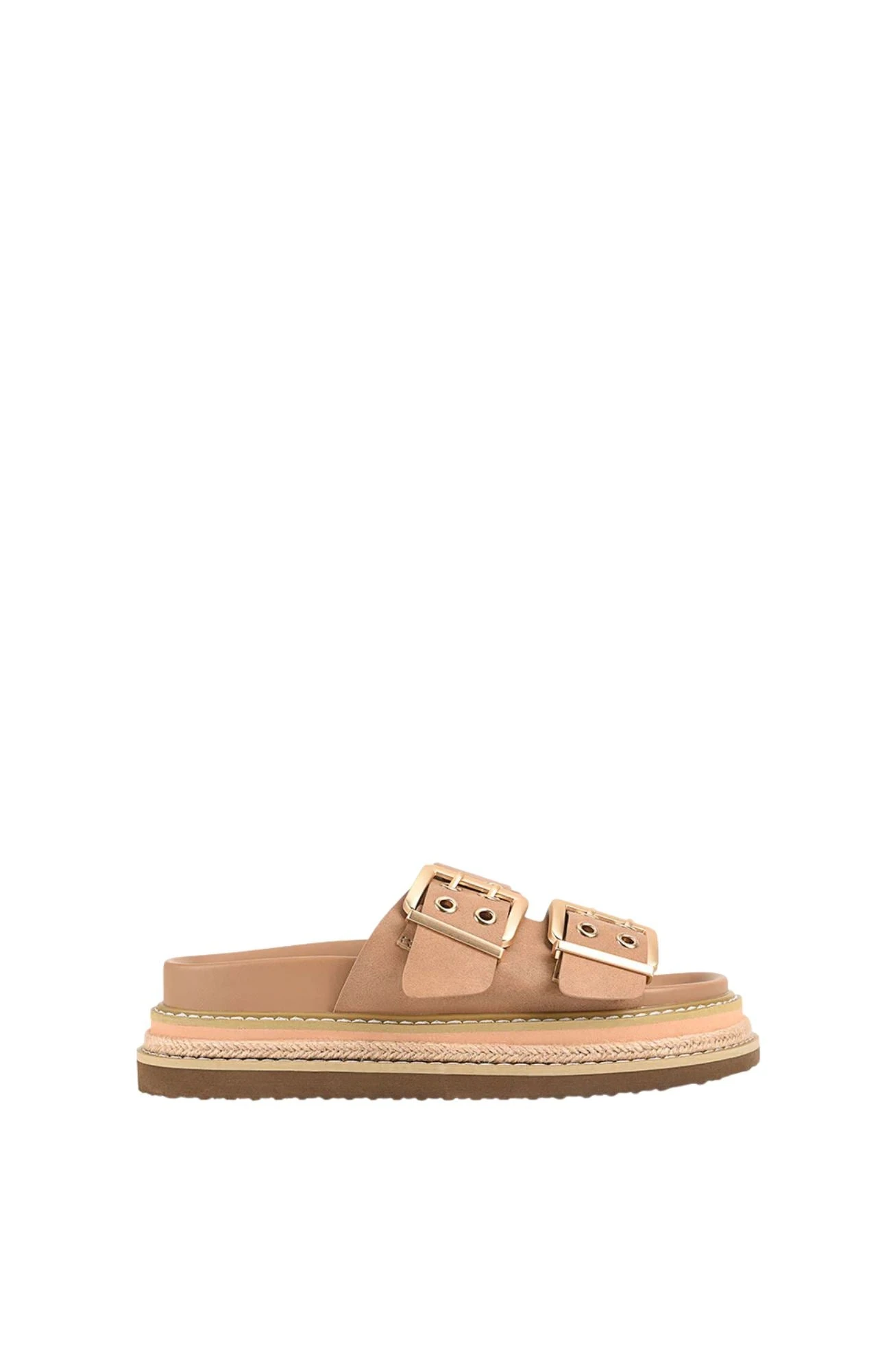 Laid-back yet elevated, the Thatcher slide is your new everyday essential. Featuring bold double buckles and a layered platform sole with espadrille-inspired detailing, it blends comfort and trend-driven style effortlessly. Perfect for warm days, long walks, or off-duty looks.