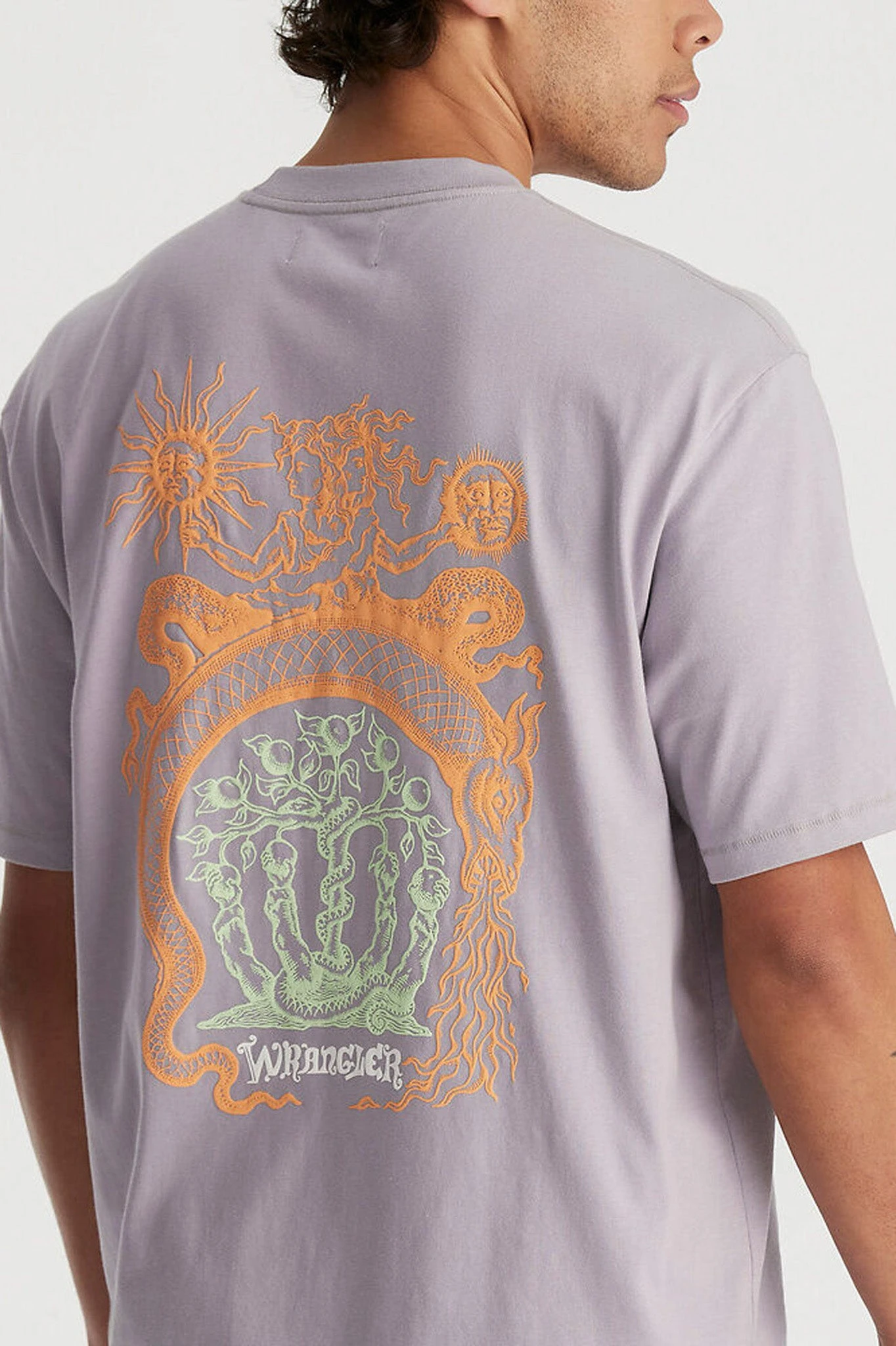 The Slacker Tee silhouette is Wrangler’s baggiest tee that fits loose on the body, and drapes when worn; designed to sit off shoulder & relaxed through the body. It has been crafted in a cotton jersey with a soft hand feel. The Earth Serpent Slacker Tee features a hand drawn psychedelic illustration in a puff print.